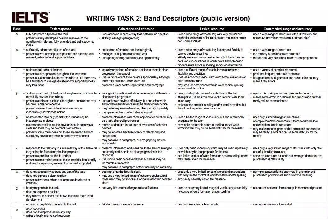 写作Task2在雅思官网(ielts.org)的评分标准为: