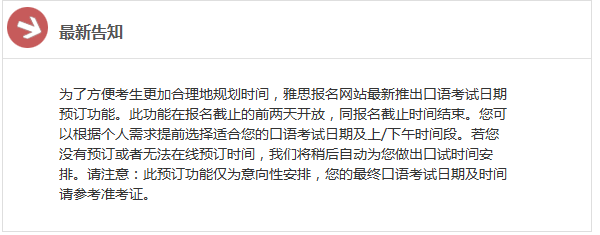 请注意:此预订功能仅为意向性安排,您的最终口语考试日期及时间请参考准考证。