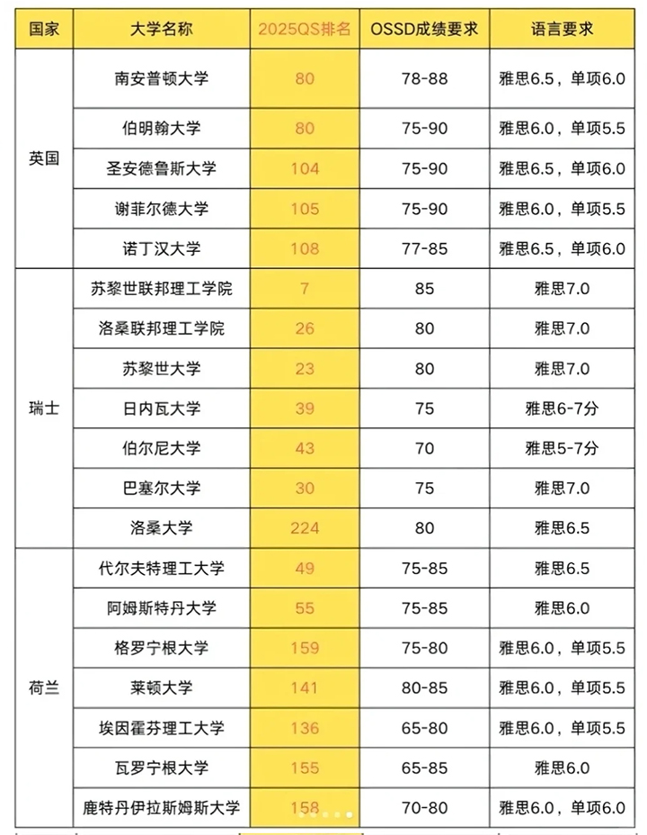 新西兰、荷兰、日本、泰国、瑞士、韩国、马来西亚、法国、德国等:这些国家和地区的大学也接受OSSD学生的申请。