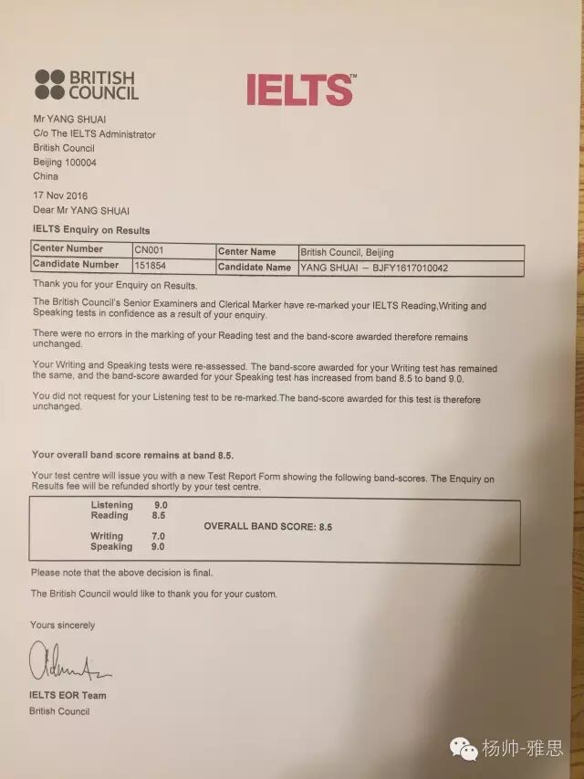 昨天终于收到了9月24日雅思考试的复议成绩单,口语到了9分。