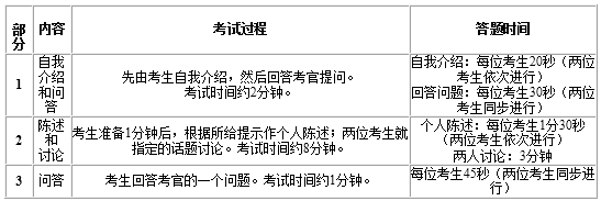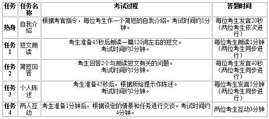 大学英语四、六级口语考试主要考核学生的英语口头表达能力,具体为:就熟悉话题进行比较流利的会话能力;表达个人意见、情感、观点的能力;陈述事实、理由和描述事件的能力。考试采用计算机化考试。考生在计算机上进行考生与模拟考官、考生与考生之间的互动。请提前登录全国大学英语四、六级考试网站(www.cet.edu.cn),熟悉考试流程。考试内容及时间分配如下表所示: