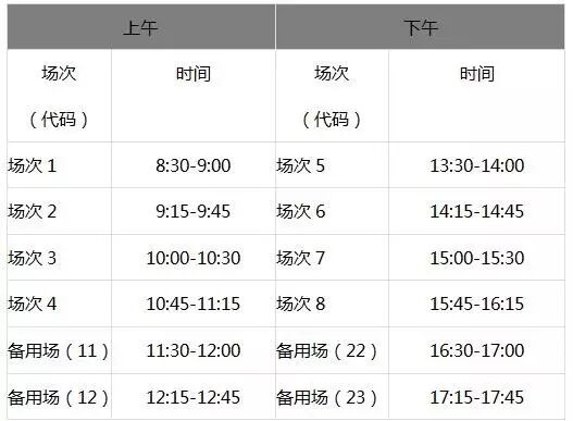 每场次30分钟,包含登录入场、测试、考试、收卷、退场等部分,其中测试及考试具体时间安排如下: