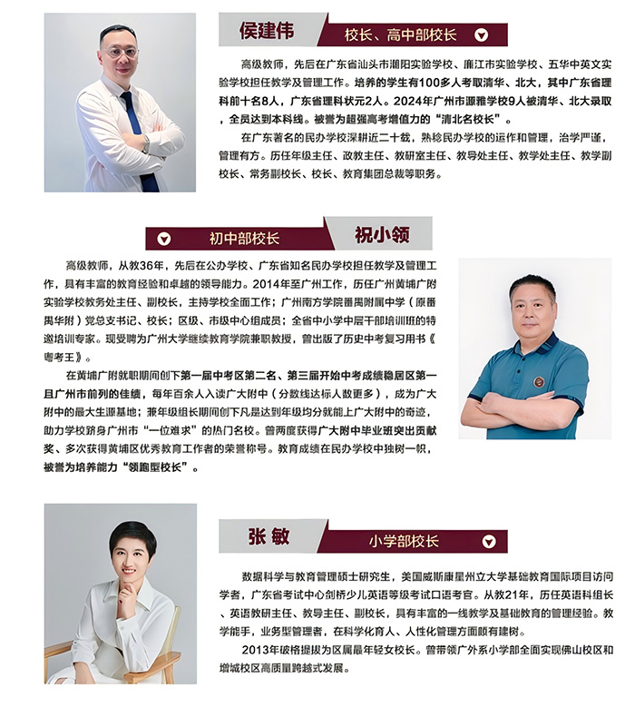 广州市源雅学校放眼全球、严格谨慎、坚持高要求高标准,遴选各领域教育精英,组建资深管理团队。以侯建伟校长、祝小领校长、张敏校长领衔的行政管理团队,带领平均教龄10年以上的各学科带头人,让优秀的人培养更优秀的人,致力于学生的全面发展。