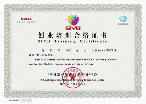 八、 考试证书:SYB学员培训合格后获得由国际劳工组织及中国就业培训技术指导中心颁发的《创业培训合格证书》。