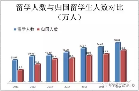 当然了,很多小伙伴看了图就想起了写作的小作文,今天咱们真的不聊写作,只谈谈数据。上图是2011年到2017年间,咱们国家出国留学的人数和归国留学生的人数变化。不出所料,出国留学人数一直高于归国留学生人数,并且两者都是稳步提升。2013年之后,两者之间的差值保持了相对稳定。(我还是感觉我在写中文版的小作文,这算职业病吗?)