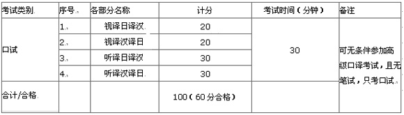 在考生具备了听、说、读、写译五方面的综合能力的情况下,重点测试考生的口译能力,进而与"日本语能力考试(1级)"形成互补凡获得中口证书或具有同等水平或具有相当于"日语能力考试1级"或"JTEST中高级 准B"以上水平的人员,经过必要的培训或训练,均可报考参加高级口译的考试。
