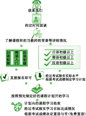 作为中,高端外语人才育成基地的龙和外语采用:初级课程打好坚实的基础; 中级课程扩大知识面和丰富知识;高级课程的知识尖端化等授课方针,适合于有(无)基础的日语,韩国语爱好者。