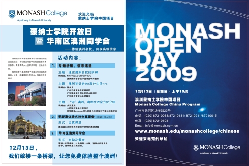 2009年12月13日--蒙纳士学院中国项目开放日暨华南区澳洲同学会,届时您可以近距离了解澳大利亚、了解墨尔本、了解monash,体验原汁原味澳洲课堂,还有澳洲同学冷餐会能让您拓展人脉、结交更多朋友。