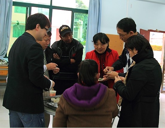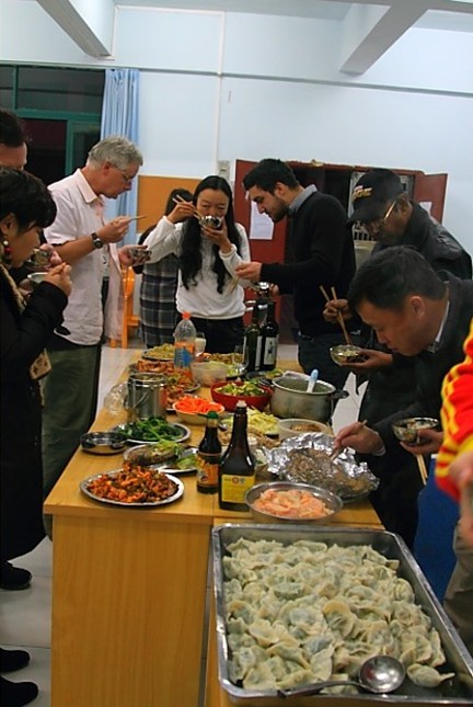 根据外教的饮食特点,我们分别准备了“包菜+胡萝卜”、“韭菜+鸡蛋”、“韭菜+猪肉”等三种不同的饺子馅,王重斌和Judy掌勺炒菜和下饺子。同时,外教和员工也拿来了他们自己准备的菜式和食品:Karen带来了浪漫的红酒,Sam和Vicky家带来了自做的蛋糕、烤羊肉、香草米饭等,Lanny家带来了地道的颇具中国特色的烟熏肉竹笋炒年糕。聚餐采用自助餐的形式,大家各取所需,美美地享受着丰盛的中西合璧美味佳肴,快乐地共同迎接新年的到来!