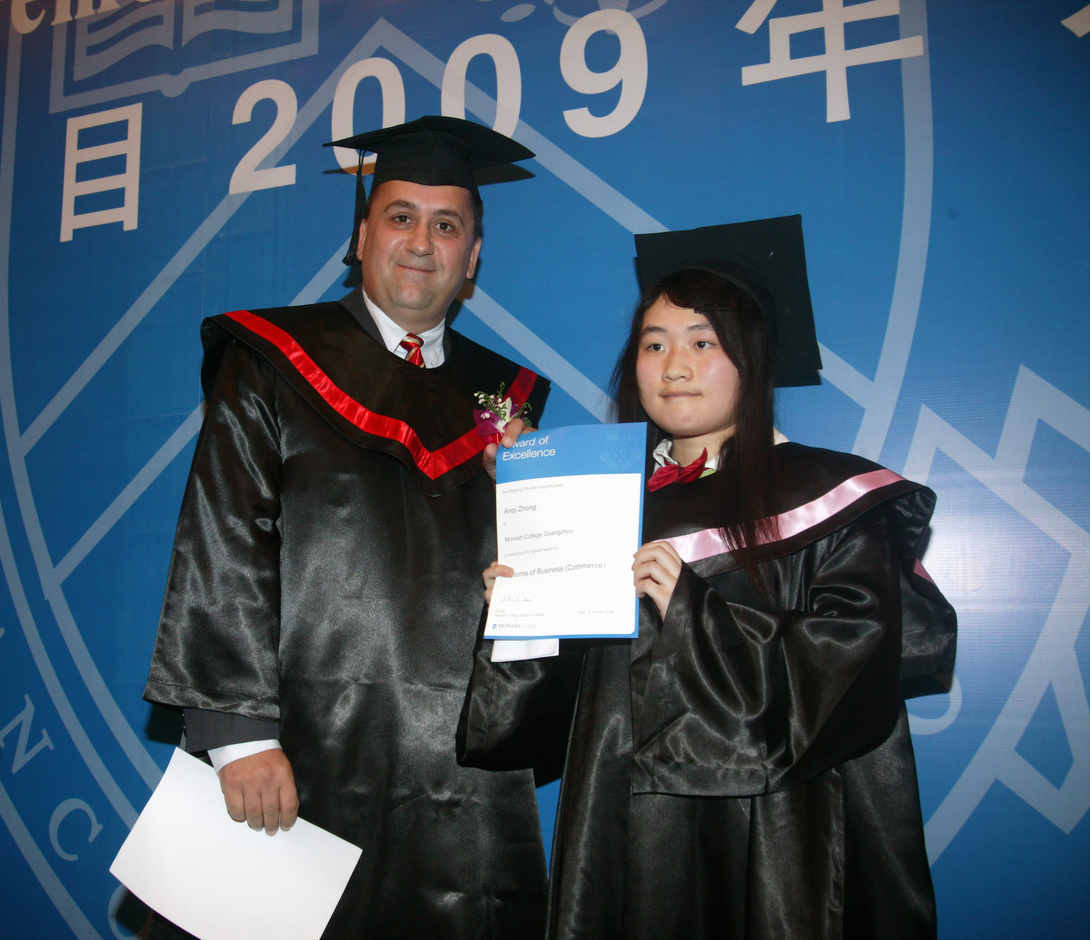 图为来自梧州高级中学的钟安琪同学接受全球蒙纳士学院商科08年秋季学期第一名的颁奖,并获颁奖学金6000澳币,钟安琪目前就读澳洲蒙纳士大学大学三年级。