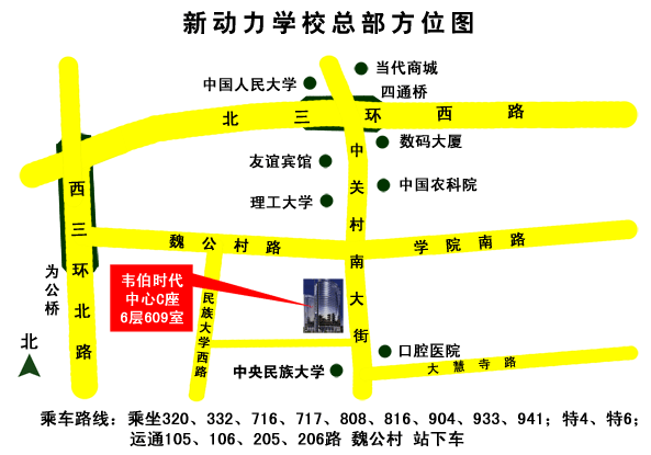 北京新动力魏公村总校 地 址:北京海淀区中关村南大街韦伯时代中心C座11层1103室