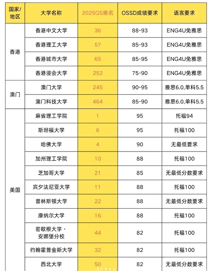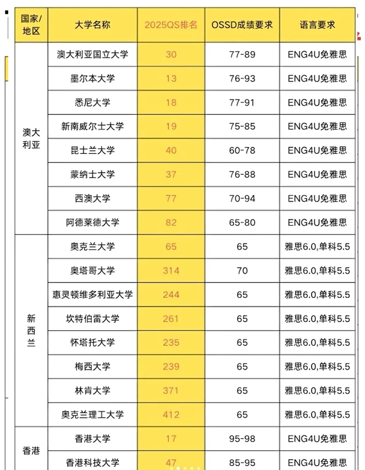 中国香港和新加坡:OSSD学生申请中国香港和新加坡的顶尖大学时,可以免雅思或托福成绩,只需12年级英语成绩满足一定标准即可。