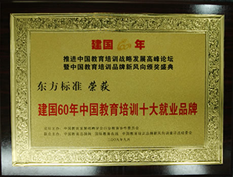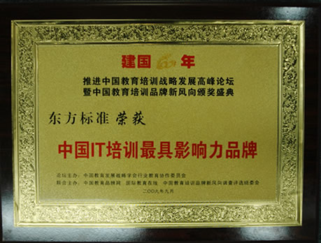 2009年9月8日,“建国60年推进中国教育培训战略发展高峰论坛暨中国教育培训品牌新风向调查评选”在北京西苑饭店正式举办,以表彰一批为祖国教育事业做出杰出贡献的民办教育培训企业。 东方标准教学总监王琴芝(左二)在颁奖现场 在本次评选中,东方标准荣获“建国60年中国教育培训十大就业品牌”和“中国IT培训最具影响力品牌”两项殊荣。 这两项荣誉的获得,既是对东方标准过去所做努力的肯定,同时也是对东方标准的激励与鞭策。东方标准在未来也将更加努力,将教育培训的事业越办越好,让更多莘莘学子能够拥有一技之长,深入发掘自己在社会上的地位与价值。