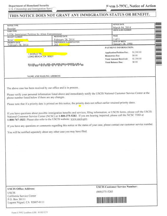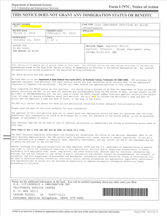 最终,仁和移民决定采用混合的资金方案,即房产抵押贷款260万加工资收入60万。经过仁和移民文案中心的不懈努力,于2014年初为客户顺利递案,并于2015年10月在无一补件的情况下顺利获得I-526的批准。