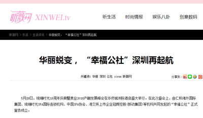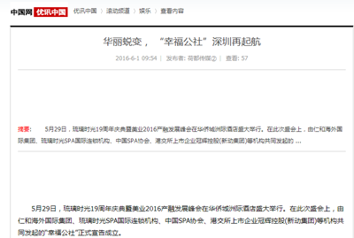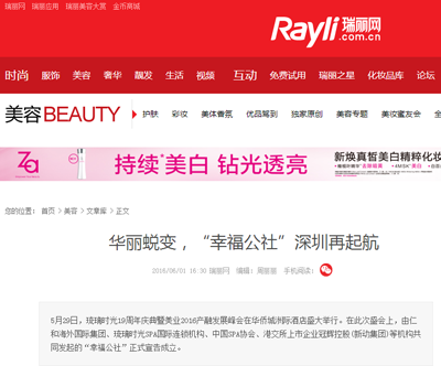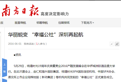 5月29日,琉璃时光19周年庆典暨美业2016产融发展峰会在华侨城洲际酒店盛大举行。在此次盛会上,由仁和海外国际集团、琉璃时光SPA国际连锁机构、中国SPA协会、港交所上市企业冠辉控股(新动集团)等机构共同发起的“幸福公社”正式宣告成立。