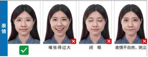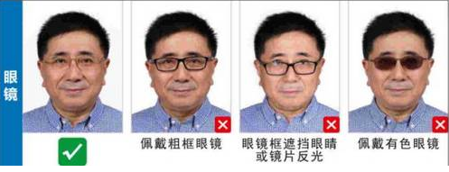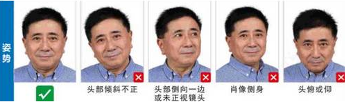 面部要求:要求申请人拍照时要正对照相机,面部特征完整,双眼睁开,嘴巴闭合,露出耳朵,神态自然,无任何动作,无明显畸形,不佩戴粗框眼镜或有色眼镜,人脸姿态左右偏转不能超过20度,上下俯仰不能超过25度。
