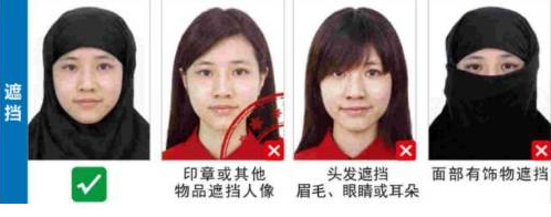 头饰要求:不建议带帽子或头巾等饰物,如因宗教原因不得不带,须确保其不遮挡申请人整个面部。