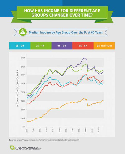 美国信用修复公司CreditRepair.com分析了过去60年中美国人的收入中位数。调查结果发现,35-44岁的美国人收入最高,紧随其后的是45-54岁的美国人。