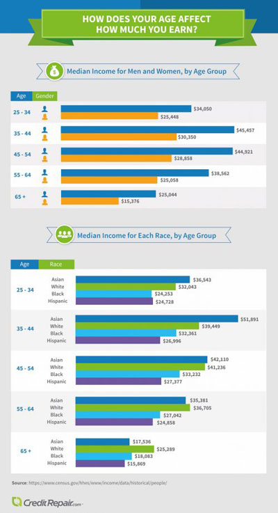 同时,调查还发现,年龄不是影响在美收入的唯一因素,种族和性别也起到非常重要的作用。数据表明,收入中位数的最大差别是呈现在不同种族之间的。在5个年龄段中,除了55-64岁和65+岁两个年龄段,其他3个年龄段中,亚裔表现最佳。